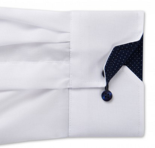 Contrast navy trim inside collar, back of cuffs and inside placket.