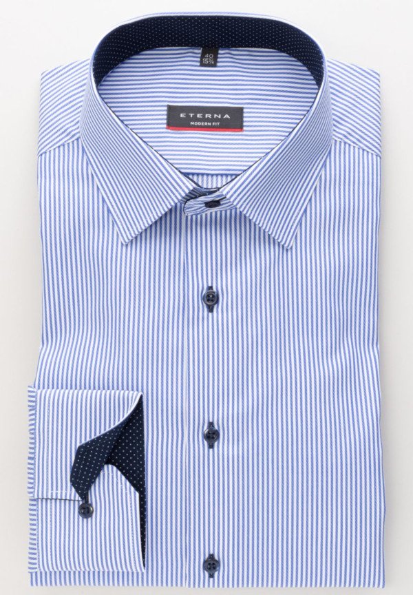 Eterna Mid Blue Fine Stripe long Sleeve Shirt With Trim. Modern Fit