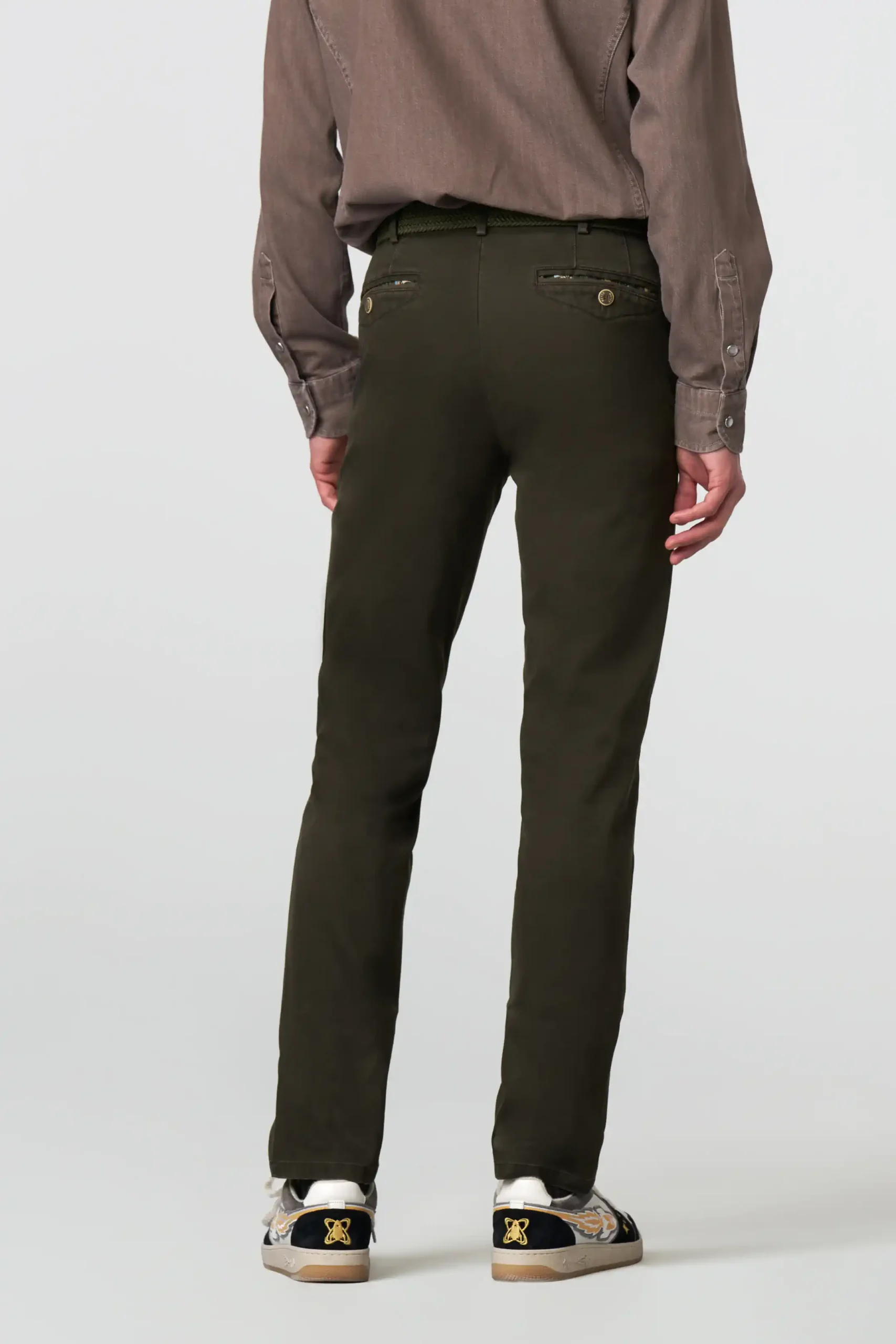 2 hip pockets with special stitching and button,