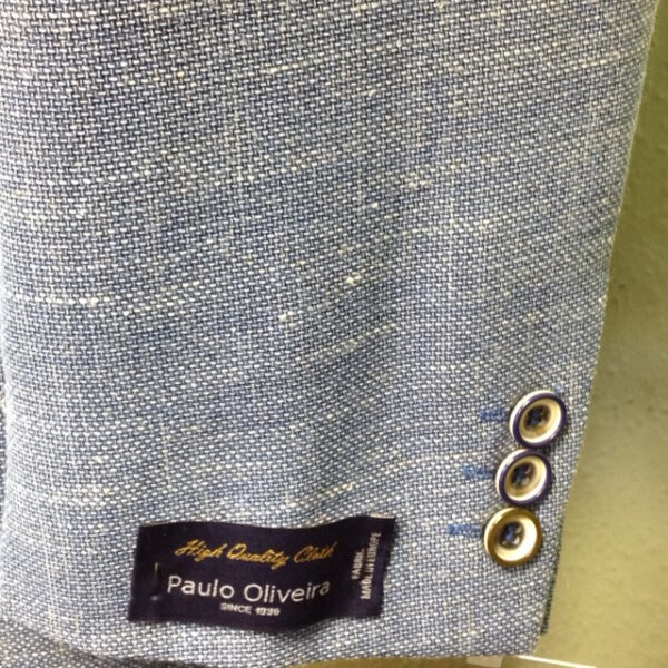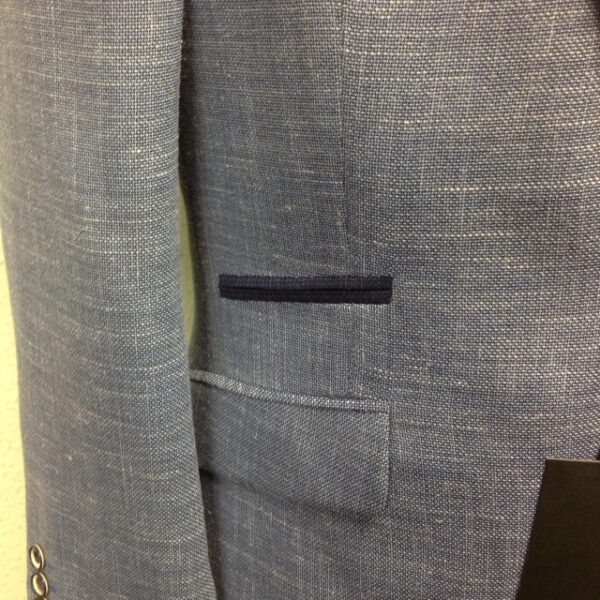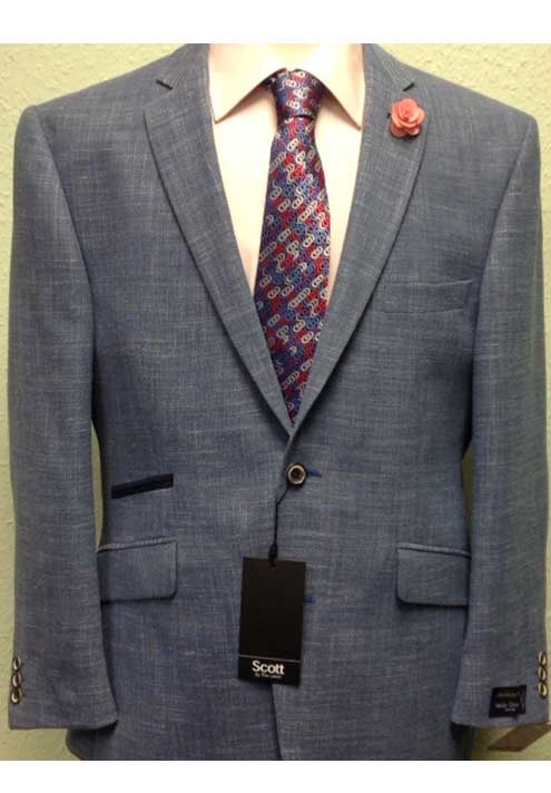 Scott Blue Linen Mix Single Breasted Jacket With Navy Piping Trim.